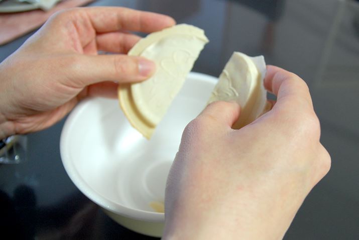 せんべいを4つに割っていきます。せんべい入りの料理は初めてなので、これで合っているかどうか、少し不安です