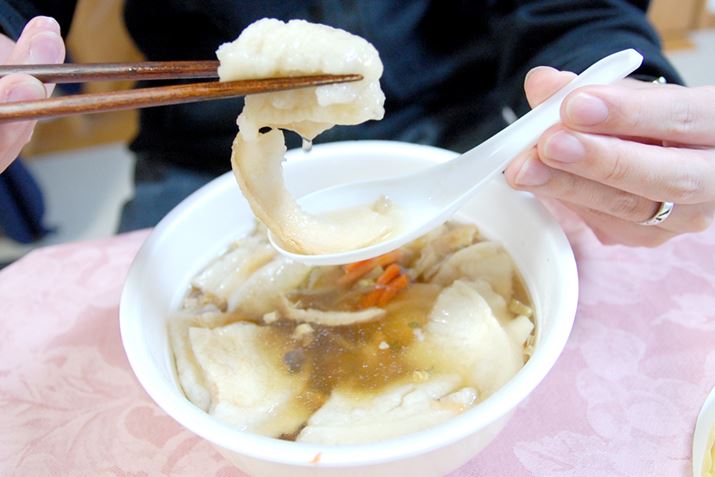 完成したせんべい汁を食べてみます。せんべいはフニャフニャですが、端っこはしっかりとした歯ごたえがあり、なんだか不思議な食感です