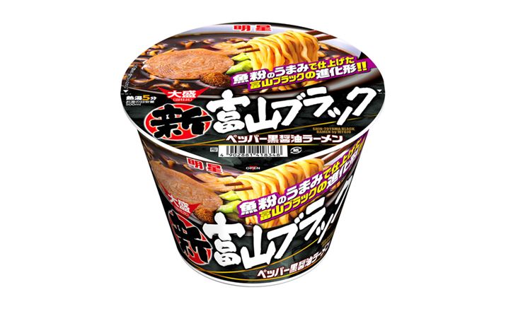 インパクトの強いビジュアルとおいしさが人気を呼び、今や、全国区の知名度を得た「富山ブラックラーメン」。最近では、首都圏でも富山ブラックラーメンを提供するお店が増えています。今回発売される「明星 大盛 新富山ブラック ペッパー黒醤油ラーメン」は、チキンや魚醤などの旨みと醤油を合わせた真っ黒なスープに、胡椒をたっぷりと効かせ、富山ブラックラーメン独特の味を再現。さらに、黒胡椒や唐辛子に、魚粉を組み合わせたふりかけで、オリジナルのアレンジを加えています。富山発のご当地ラーメンをぜひお試しください!