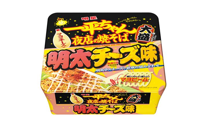 梅雨が過ぎれば、夏本番。暑い時期は、ついつい辛いものが食べたくなってきます。「明星 一平ちゃん夜店の焼そば 大盛 明太チーズ味」は、辛みがアクセントの大盛焼きそば。ソースは、ポークの旨みをベースに、ガーリックやジンジャー、魚醤を加えて、たらことチーズ風味のオイルを合わせたという醤油味。そこに、明太子の辛みと食欲をそそるチーズの香り、特製マヨネーズのコクが加わり、みごとなコンビネーションを形成。「いっぺん食べたら、やめられない」ハマる味わいになりました。