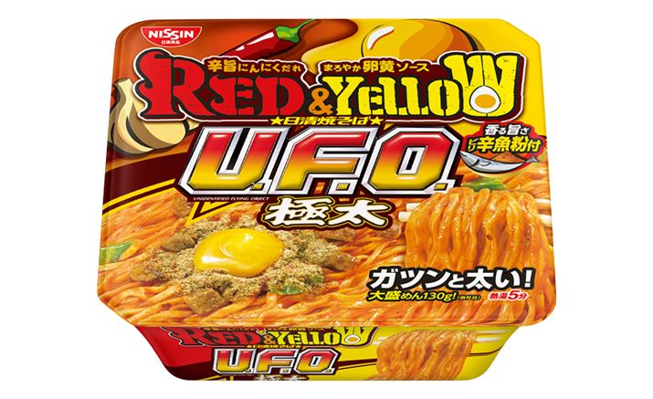 「食欲旺盛な若者へ捧ぐ! 極太麺×ガッツリ系メニューの食べ応え」をコンセプトに、カップ焼きそば「U.F.O.」が極太めんへと進化した「U.F.O. 極太」シリーズ。今回発売される第2弾は、唐辛子とニンニクを効かせたしょうゆベースの“REDソース”と、まろやかな卵黄の“YELLOWソース”が特徴の「日清焼そばU.F.O.極太 RED & YELLOW」。これらのソースに加えて、さば節、いわし煮干し、宗田かつお節、むろあじ節という4種の魚粉に唐辛子を混ぜ込んだ、特製ピリ辛魚粉で仕上げます。具材は、ポークミンチと大切りキャベツ。食欲をそそる辛口で濃厚な味わいをお楽しみください。