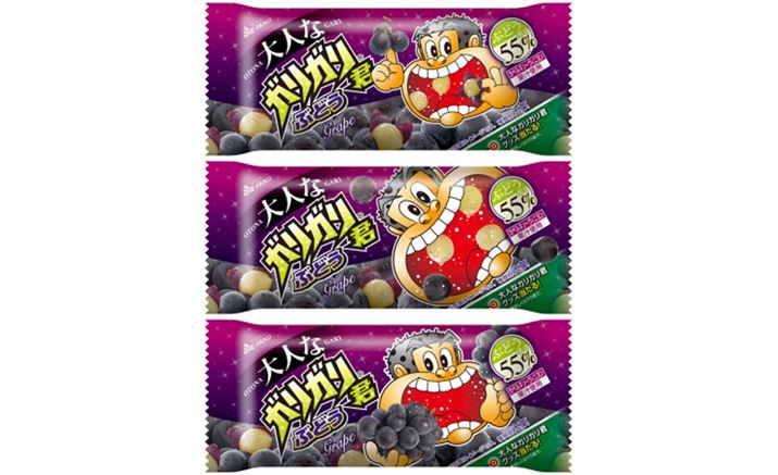 「レモン」「白桃」「グレープフルーツ」と、手を替え品を替え、新たな味わいを追求した今年のガリガリ君。夏のフィナーレを飾るのは、大人味を極めた「大人なガリガリ君 ぶどう」。ぶどうといっても、そんじょそこらのマスカットや種なしぶどうとはひと味違う、赤ワインぶどう品種の王様「カベルネ・ソーヴィニヨン」を採用。果汁を55%使用し、まるでワインのような芳醇な香りと、深みのある大人な味わいを表現しました。さらに、かき氷の粒度も調整し、食べ心地はジェラートのよう。甘さだけでなく、酸味と渋みも楽しめる、大人のためのガリガリ君です。