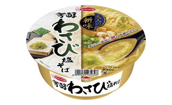 まだまだ残暑が厳しい毎日、ピリッと辛いものが食べたくなりますよね。「大人の斬味 芳醇わさび塩そば」は、わさびの辛さをピリッと効かせた大人向けのカップ麺。スープは、チキンベースに真鯛の中骨を焼いて炊き出したエキスを加え、鯛の旨みをしっかりと効かせた鯛だし塩スープ。そこに、本わさび入りの特製ペーストが加わり、清涼感あふれる辛さがお口の中に広がります。かやくは、鯛だしスープと相性のいい、ほどよく味付けした鶏団子。「大人の斬味」という名の通り、ほかのカップ麺とはちょっと違った大人の味をお楽しみください。
