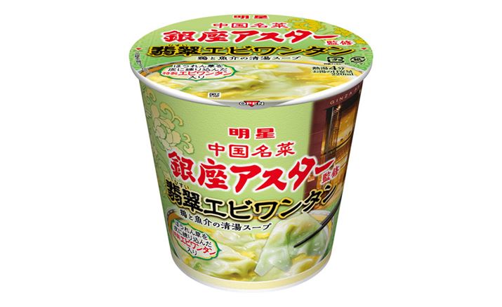 銀座に本店を構える「中国名菜 銀座アスター」は、昭和元年(1926年)に創業した老舗の中国料理専門店。「明星 銀座アスター監修 翡翠エビワンタン」は、その銀座アスターによる監修のもと、同店の主力メニューである「翡翠麺(ひすいめん)」をアレンジしたワンタンスープです。ワンタンの皮にほうれん草を練り込み、エビあんを包んだ「翡翠エビワンタン」は、モチモチとした食感で食べごたえあり。スープは鶏ガラをベースに、ホタテ、アサリを加えて、香味野菜とペッパーで味を調えました。緑のワンタンと、黄色のかきたまスープが見た目にも美しい一杯です。