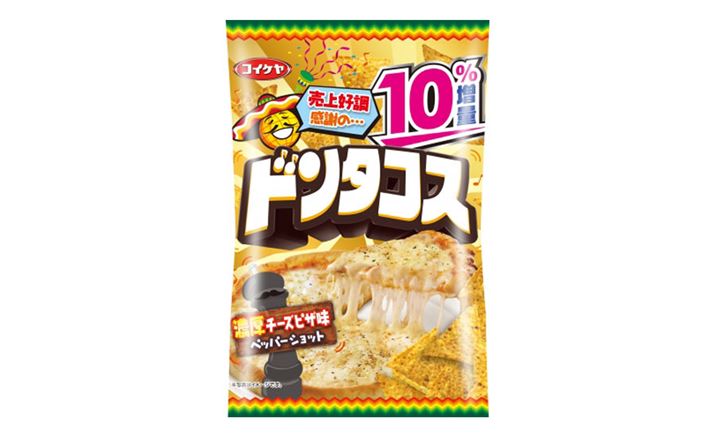 「ドンタコス」ブランドの新フレーバーは、チーズのコクとペッパーがあとを引く「ドンタコス 濃厚チーズピザ味 ペッパーショット」。コクと旨みのあるチーズが乗ったピザの濃厚な味わいを、ピリッとキレのよいペッパーで仕上げました。コーンの甘みやチーズの旨みとペッパーの刺激を、ぜひお楽しみください。なお、湖池屋では9月12日から9月24日までの期間限定で、「ドンタコス チリタコス味」、「ドンタコス 焼きとうもろこし味」、「ドンタコス 濃厚チーズピザ味 ペッパーショット」の3品を10%増量するとのこと。こちらも見逃せません!