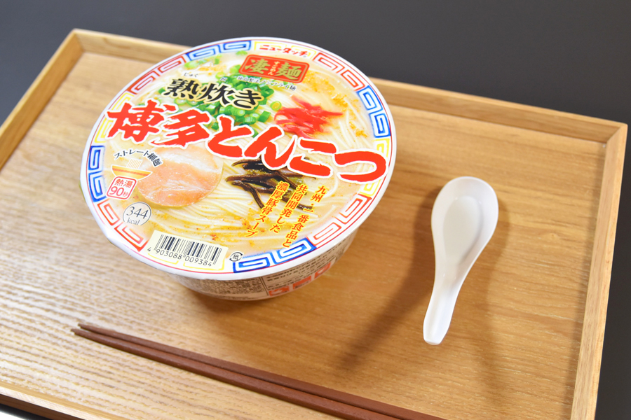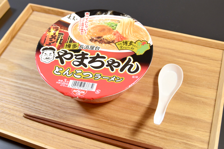 そんな福岡のご当地カップ麺は、どのようなものなのでしょうか。今回チョイスしたのは、「熟炊き博多とんこつ」(ヤマダイ)と「博多長浜屋台やまちゃん」(日清食品)の2つ。それではまず、「熟炊き博多とんこつ」から作っていきます。