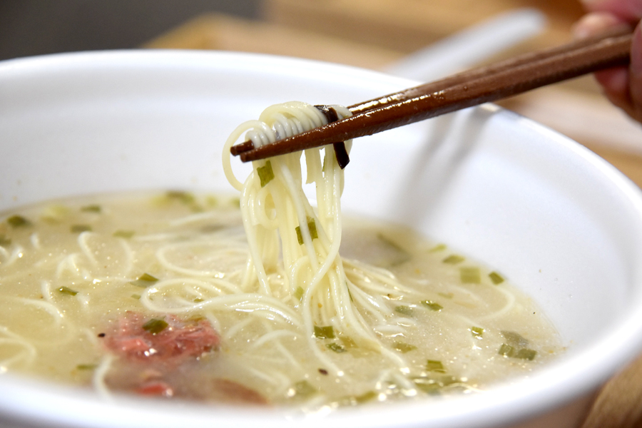 熟炊き博多とんこつを作るのは、時間との勝負。なんと、たった90秒でできあがってしまいます。スープを混ぜる時に、もたついていると、すぐに麺がふやけてしまうので注意が必要です。粉末スープと液体スープは、手早く混ぜるのがポイント。