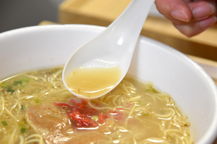 スープは濃厚で、こってりしたコクが感じられます。しかし、飲み終わった後は意外にもスッキリ。細麺によくからんで、美味しくいただくことができました。具材は、チャーシュー、キクラゲ、ネギ、ゴマなど、オーソドックスな豚骨ラーメンに入っているラインアップ。屋台で食べているイメージを浮かべながら、美味しくいただきました。満足度も十分です。
