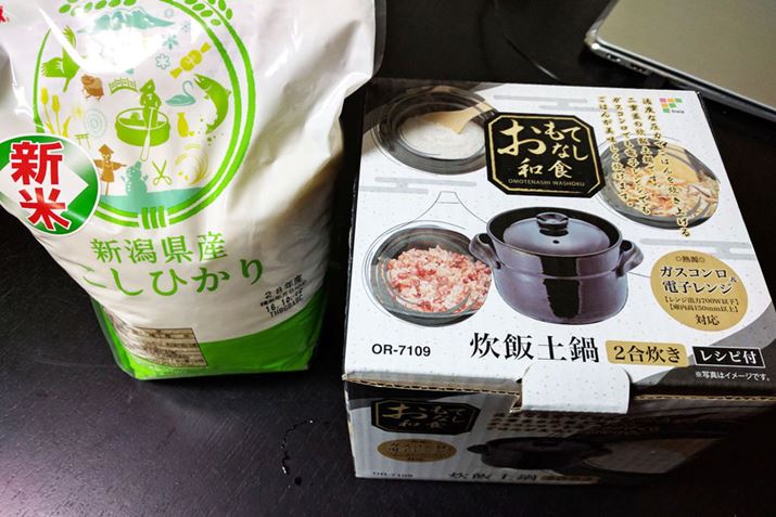 せっかくの卵かけごはんなので、ご飯の炊き方とお米にもこだわりました! 炊き方は、先日通販で買った、レンジでもコンロでもOKなおいしく炊けると噂の炊飯土鍋を使います。お米は新米こしひかり。ごはんを炊くのは小学校のキャンプ以来かな〜。うまく炊けるか心配です。