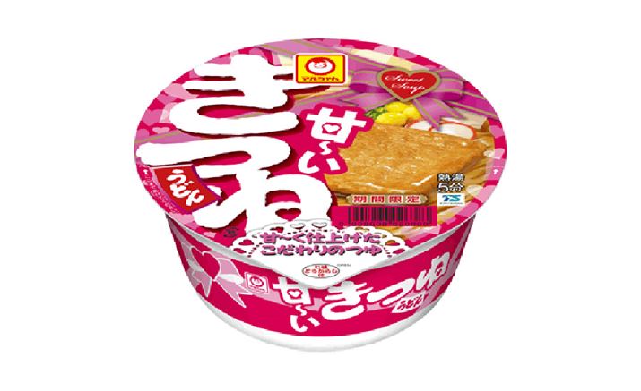今年のカップ麺業界は、ひと味違う! 「明星 一平ちゃん夜店の焼そば チョコソース」(明星食品)と「ペヤング チョコレートやきそばギリ」(まるか食品)に続いて、バレンタイン商戦に参戦するのは、東洋水産の「マルちゃん甘ーいきつねうどん」。かつお節、雑節、昆布、煮干しという基本のダシに、甘い味付けに仕上げた別添の特製つゆを追加し、“バレンタインデーらしさ”を演出します(?)。カップとふたはピンク色が基調で、ハートやリボンの姿も。さてさて、カオス状態の甘いカップ麺戦争、最後に笑うのはいったいどれか?