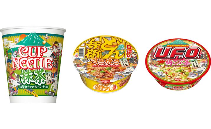 昨年発売45周年を迎えた「カップヌードル」、40周年を迎えた「日清のどん兵衛」、「日清焼そばU.F.O.」の3ブランドから、和の世界観を表現した「じゃぱん ぬーどるずトリオ」が登場。カップヌードルは、茶そば風の緑色の麺を採用し、クリーミーで濃厚なシーフード味のスープに抹茶の風味を加えました。日清のどん兵衛は、甘めの割り下に肉汁の旨みがたっぷりと溶け出したつゆで、すき焼きの味わいを再現。日清焼そばU.F.O.は、和の代表的な素材である梅と昆布を使用し、梅こぶ茶の味をイメージした旨みと酸味が広がる塩焼そばに仕上げました。
