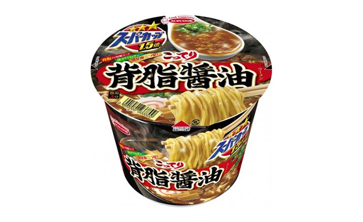 食べごたえとリッチ感あるスープのおいしさを追求した「三つ星スーパーカップ」シリーズより、背脂の旨味が存分に味わえる「こってり背脂醤油ラーメン」が発売されます。スープは、チキンとポークをベースに、ガーリックやオニオンなどの香味野菜を加えたコクのある醤油味。これに背脂を配合することで、脂の甘みがクセになる醤油ラーメンに仕上げました。スープのインパクトに負けない、噛みごたえ抜群の「カドメン」との相性も抜群!