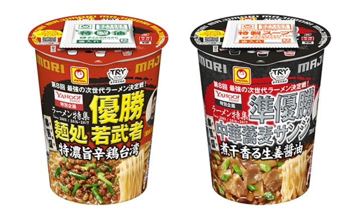 “今までになかった次世代ラーメンを生み出す”というコンセプトのもと、「Yahoo!特別企画 ラーメン特集2016-2017」で開催された「第8回 最強の次世代ラーメン決定戦!」。今回、「次世代部門」の優勝に輝いた「麺処 若武者」と、準優勝の「中華蕎麦 サンジ」の味を製品化したカップ麺が登場します。麺処 若武者の「特濃旨辛鶏台湾」は、チキンをベースに辛味を効かせた濃厚鶏白湯スープに極細の丸麺を、中華蕎麦 サンジの「煮干香る生姜醤油」は、チキンとポークをベースに、煮干しと生姜を効かせた醤油味のスープに太めの角麺を組み合わせました。多くの支持を集めたラーメンの味を、カップ麺でお試しください。