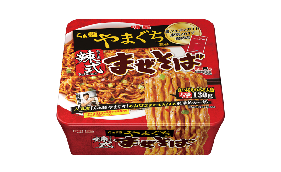 「らぁ麺やまぐち 辣式(らつしき)」は、2015年に東京・東陽町でオープンし、開店わずか1年にして「ミシュランガイド東京2017」に掲載された、今注目の人気店です。今回、看板メニューである「麻婆まぜそば」の味を、店主の山口裕史氏による監修で再現。食べごたえのあるモチモチ食感の太麺に、唐辛子と豆板醤で辛味をつけたチキンエキスベースの醤油ダレをからめて食べます。さらに、店主こだわりの隠し味でコクを加え、花椒オイル、辣油を合わせることで、辛いのに後をひく味わいとなりました。