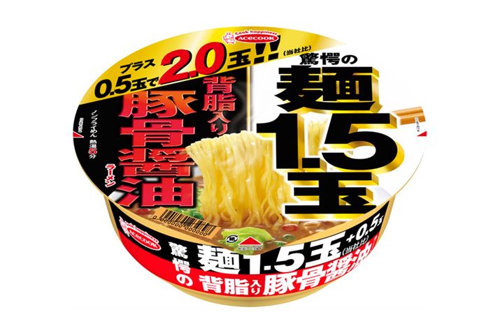 九州とんこつラーメンではおなじみの「替え玉」。その起源は、博多の長浜ラーメン店がサービスを提供したのが始まりと言います。カップ麺なので替え玉というわけにはいきませんが、ボリュームを求める方に朗報なのが、エースコックの「驚愕の麺1.5玉+0.5玉の背脂豚骨醤油ラーメン」。「驚愕の麺1.5玉」シリーズの発売5周年を記念して、0.5玉増量した「2玉」で発売します。スープは、たっぷりの豚骨エキスと醤油を使用した濃厚な豚骨醤油で、背脂のコクや、にんにく、胡椒などの香辛料のパンチを加え、2玉の麺を最後まで飽きずに食べられます。最後の一本、一滴まで、心ゆくまでご堪能ください。