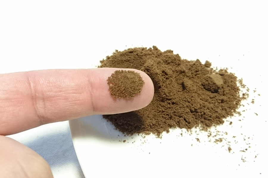 この製法で作られた「プレミアム微顆粒パウダー」のきめ細かさは、ほかのインスタントコーヒーと比べると一目瞭然! 指で触るとご覧のとおり。まるで片栗粉のような細かさです(一気に庶民的な説明、失礼しました)。