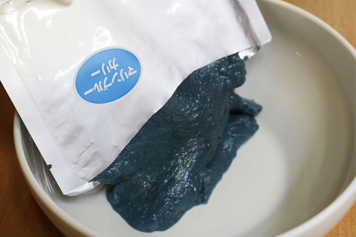 マリンブルーカリーを開封。きれいなマリンブルーというか群青というか。この青色はクチナシの青色素でつけられているもよう