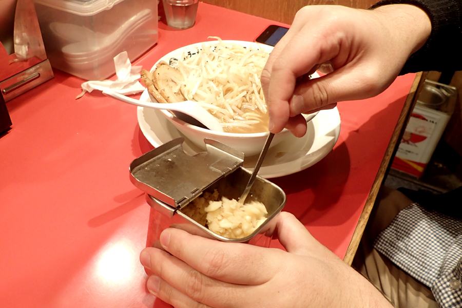 ニンニク風味が物足りないという方は、カウンターに置いてあるニンニクを、好きなだけ入れるといいでしょう。汗が一気に吹き出てきて、パワーアップした気分になってきます