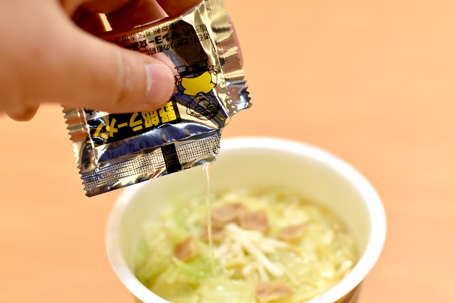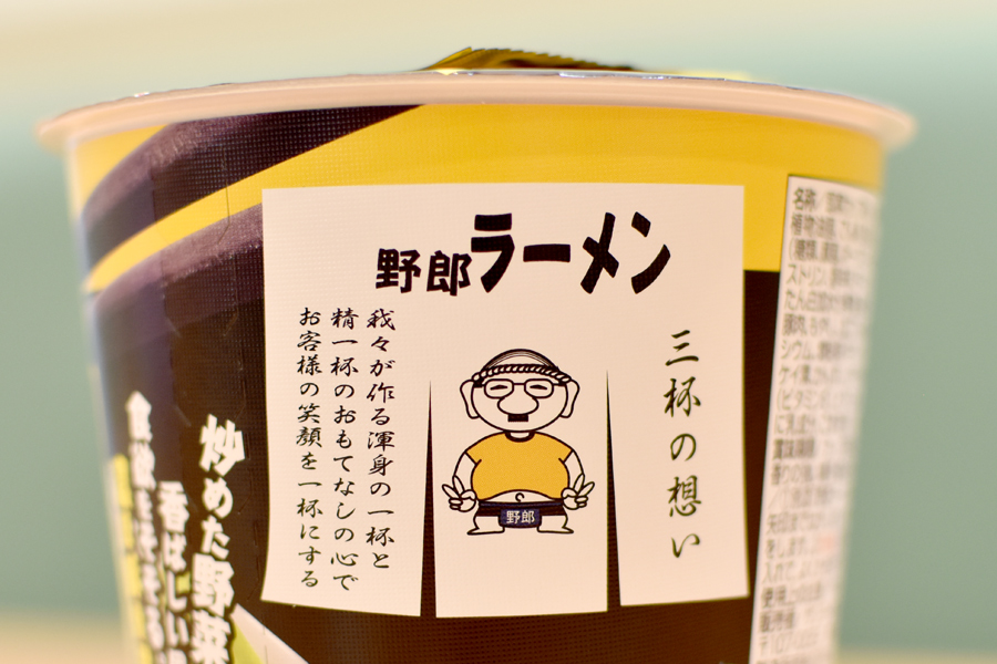 渋谷センター街 総本店の味を確認した後は、サッポロ一番が発売するコラボカップ麺を食べて、お店の味と比較してみます。パッケージを見ると、大きな文字で「野郎ラーメン」と書かれているうえ、ヘソ出しピース姿が印象的なマスコットキャラの“おじさん”も、ちゃんと描かれています。パッケージのフタには、香味オイルが付属しており、さらにコクのある味わいに仕上げられそうです。