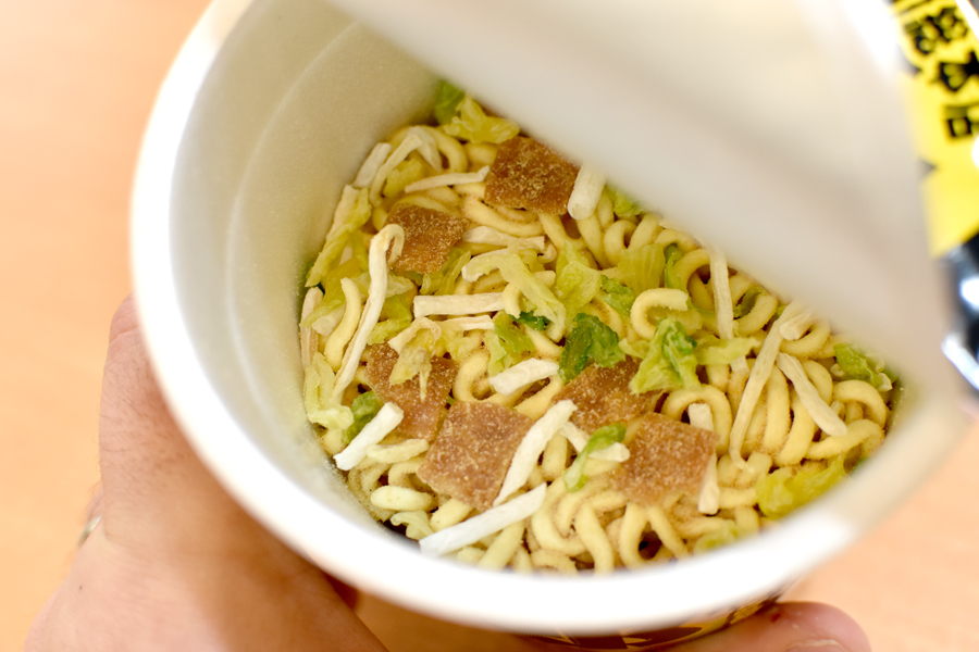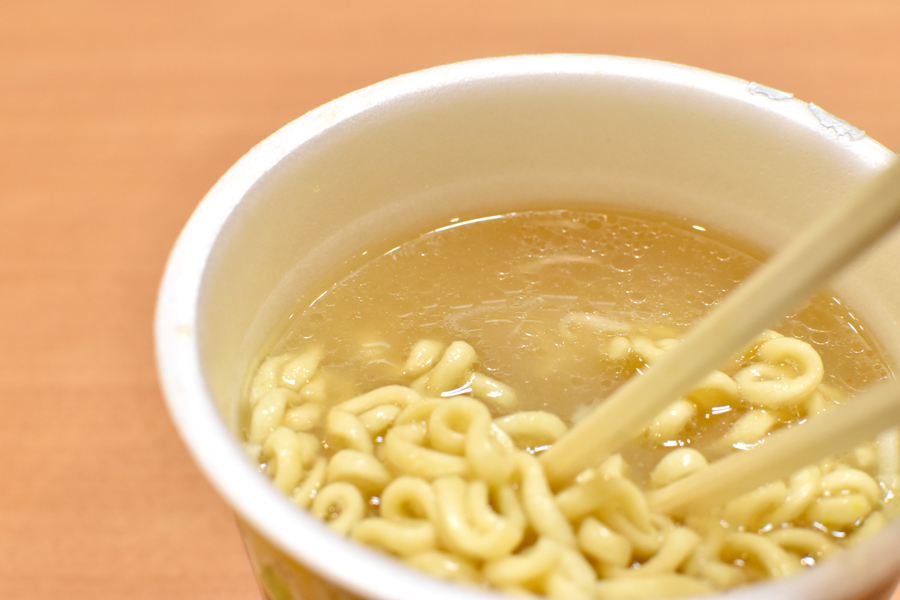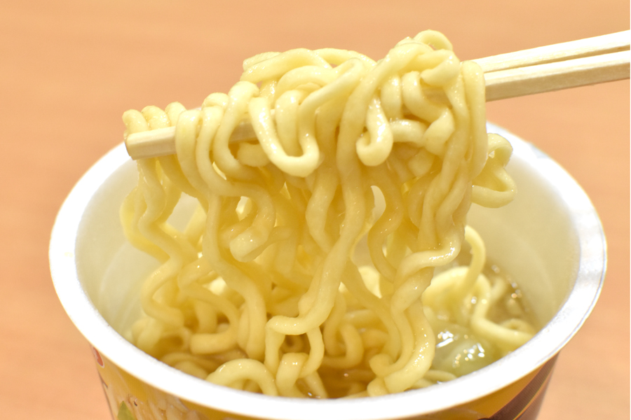 お湯の量は400mlで、タテロング型のカップ麺としてはめずらしく、熱湯を入れて5分待つ必要があります。その理由は、麺の太さにあり。“極太タイプのカップやきそば”並みに太い麺を使用しているため、お店の極太麺のイメージそのままです。