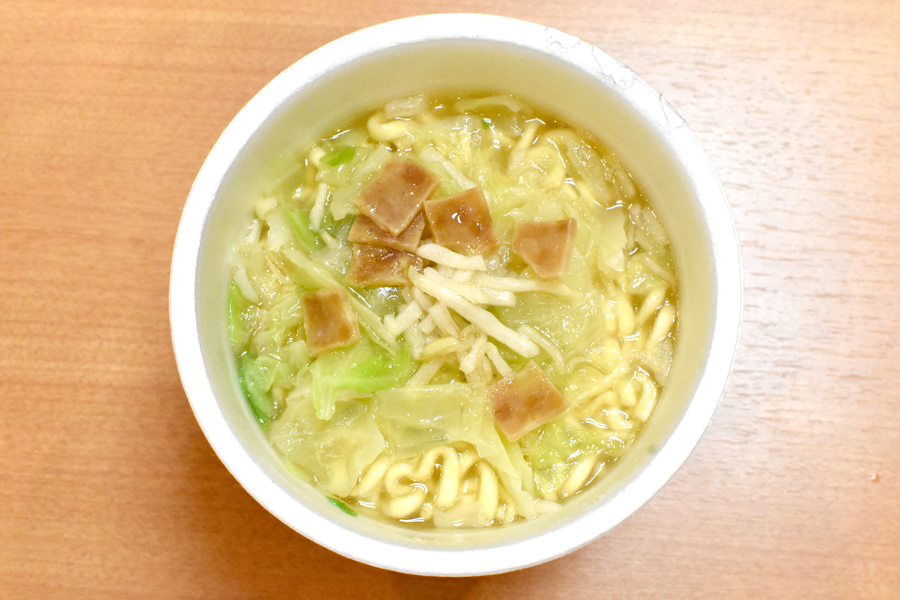 野郎ラーメンのコラボカップ麺が完成しました! お湯を入れると、キャベツともやしが水分を吸ってふくらみ、ボリュームが出てきました