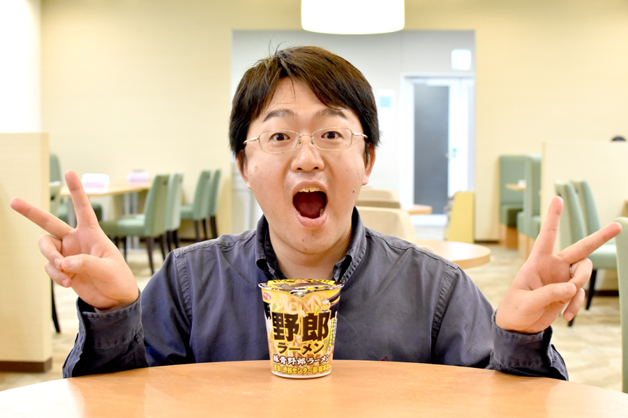 さすがにヘソ出しとはいきませんが、マスコットキャラの“おじさん”と同じポーズをしてみました。“二郎系”初心者の方は、まずこちらのコラボカップ麺を食べてみては?