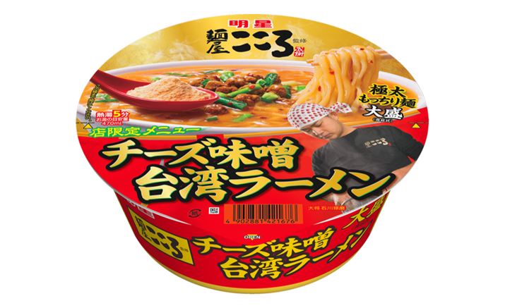 「麺屋こころ」は、東京・大岡山に本店を構え、首都圏を中心に14店舗を展開している人気店。看板メニューは「台湾まぜそば」ですが、今回、一部店舗のみ発売する期間限定メニュー「チーズ味噌台湾ラーメン」をカップ麺でも再現。お店の提供開始と同じ、3月13日より「明星 麺屋こころ監修 チーズ味噌台湾ラーメン 大盛」が発売されます。麺は、もっちりとした食べごたえのある極太麺。スープは白味噌をベースに、麦味噌と赤味噌をブレンドして、かつおだしと赤唐辛子を効かせた味噌ペーストに、ニラの香りのオイルを加えました。さらに、かやくのチェダーチーズとパルメザンチーズを投入して、チーズと味噌のコクと唐辛子の辛さが効いた味に仕上がります。