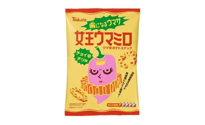激辛トウガラシ「ハバネロ」を使った刺激的なスナック「暴君ハバネロ」。そのライバルである「女王ウマミロ」がパワーアップしてリニューアルします! チキン・オニオン・ガーリックをベースとした点は同じですが、今回のリニューアル版では、甘みが強い淡路島産玉ねぎと熟成された黒ニンニクを使用。隠し味に椎茸と昆布茶を加え、それぞれの食材の旨みをさらに引き出しました。「暴君ハバネロ」は激辛ですが、「女王ウマミロ」は、ほどよい辛みを効かせた「チョイ辛チリ味」。10個の小さなリングがつながったリング形状で、カリッと軽快な食感をお楽しみください。