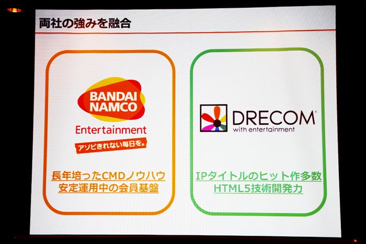 バンダイナムコエンターテインメントでは「長年培ったCMDのノウハウや安定運用中の会員基盤」、ドリコムでは「多くのIPタイトルのヒット作やHTML5の技術開発力」、BXDではこの両社の強みを融合して新たなエンターテインメントを提供していくと説明する
