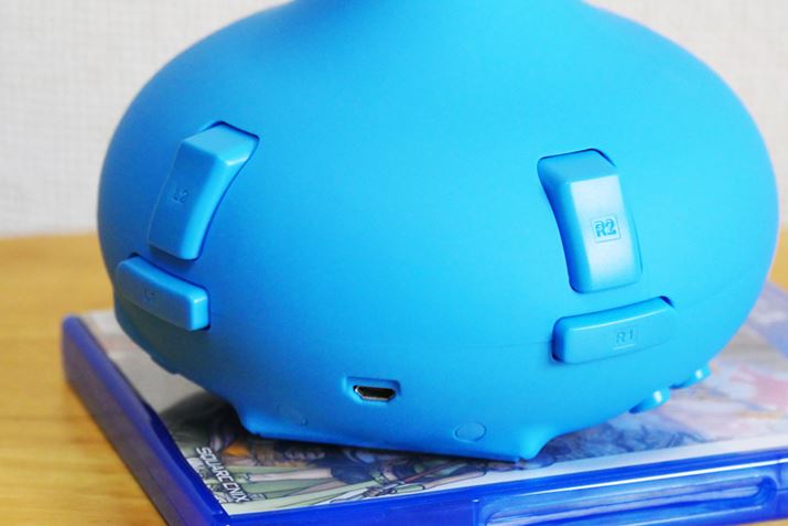 背面には「L1」「L2」「R1」「R2」ボタンのほか、microUSBポートを搭載しており、付属のUSBケーブルでPS4やアダプターに接続して充電。使用時はBluetoothでPS4に接続します