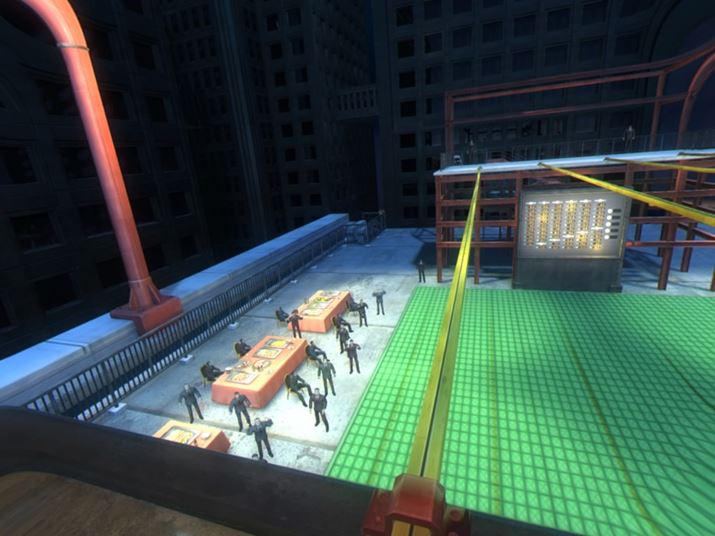 下を見ると、鉄骨の細さと高さからくる恐怖で足がすくみます。プレイ中の同僚に「ちょっと後ろを振り返ってみてください」と伝えたのですが、「今体を動かすのは無理ですっ!」と叫んでいました