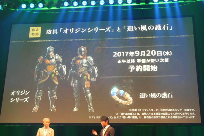 世界同時発売となる「モンスターハンター:ワールド」。ダウンロード版は予約特典として防具「オリジンシリーズ」と「追い風の護石」が用意される。パッケージ版も予約特典として同アイテムが用意されるが、こちらは数量限定となっている