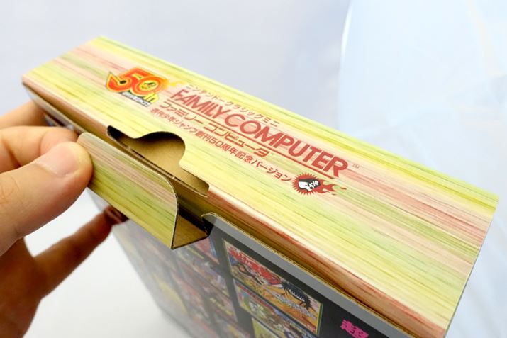 パッケージの上部も、週刊少年ジャンプにそっくり。「ニンテンドークラシックミニ ファミリーコンピュータ 週刊少年ジャンプ創刊50周年記念バージョン」というロゴも描かれています。さぁ、開封だ!