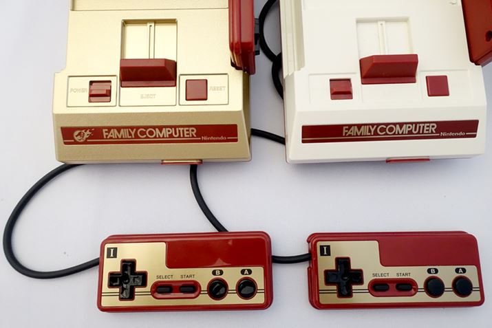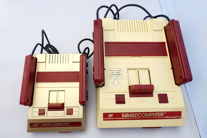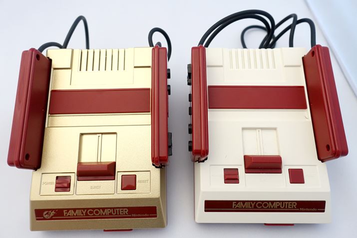 年季の入ったファミコン(写真右)とジャンプ版ミニファミコン(写真左)を比べてみました。黄色の具合は、黄ばんだファミコンといい勝負?