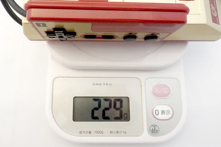 ミニファミコンと変わらない点、その1。ファミコンを約60%に縮小した本体サイズは、そのまま継承。本体サイズは108.12(幅)×50.45(高さ)×142.47(奥行)mm(本体にコントローラーをセットした状態)。重量もミニファミコンと変わらず、約229g(コントローラーを含む)です