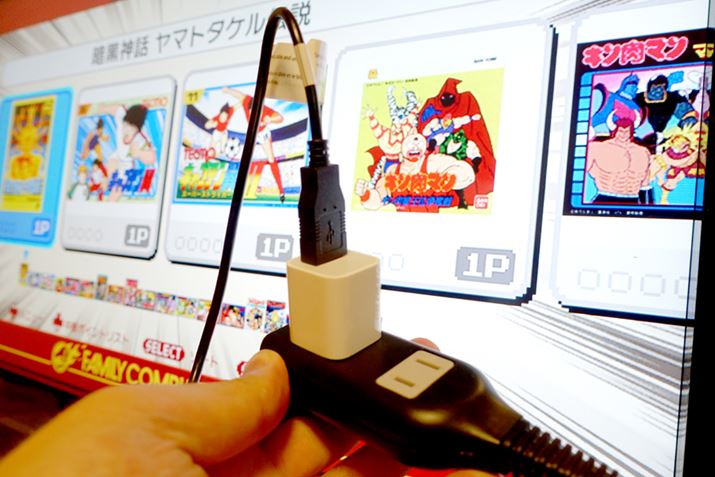 ミニファミコンと変わらない点、その4。電源供給についても、変更はなし。USBバスパワー対応のテレビや液晶ディスプレイのUSBポートに直接接続するか、別売りのACアダプターをUSBケーブルに接続します。なお、5V/1.0A出力に対応したACアダプターであれば、純正以外にも対応するとのこと。iPhone付属のACアダプターも使用できます