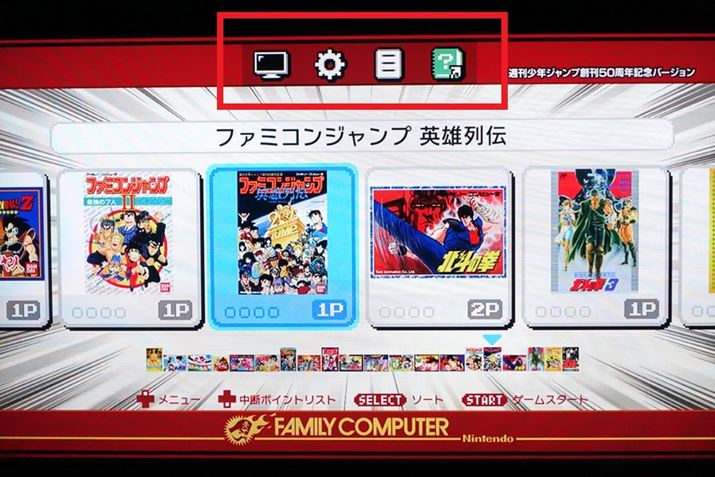 ミニファミコンでは、8bitサウンド(ピコピコ音楽)によるオリジナルテーマ曲が流れていましたが、ジャンプ版ミニファミコンでは、それとは異なる“少年マンガっぽい”曲が流れ、続いて、ファミコンジャンプのタイトル画面をアレンジしたデモが表示されます。
