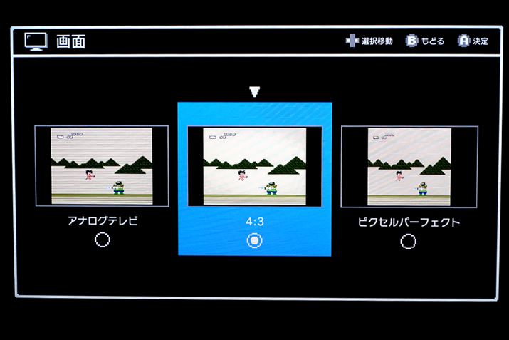 ミニファミコンと変わらない点、その7。「設定」アイコンを選択して、走査線や色のにじみなどを再現した「アナログテレビ」、画面比率が4:3の映像を表示する「4:3」、1ドットを正方形にして表示する「ピクセルパーフェクト」を設定できます