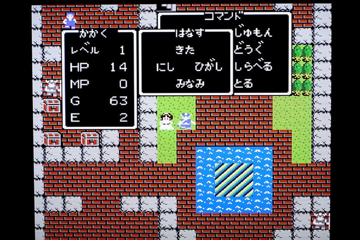 「ドラゴンクエスト」。当時を知らないユーザーは、“カニ歩き”で歩く主人公の姿と、もの悲しくピコピコ音が響く「広野を行く」(フィールドのBGM)に衝撃をおぼえるのでは? さらに、街の人々に話しかける際に表示される「きた・みなみ・にし・ひがし」、階段を上り下りする際の「かいだん」、魔法の鍵で扉を開ける際の「とびら」、足もとを調べる「しらべる」、宝箱を取る「とる」など、それぞれの動作に各コマンドが用意されているのも時代を感じます