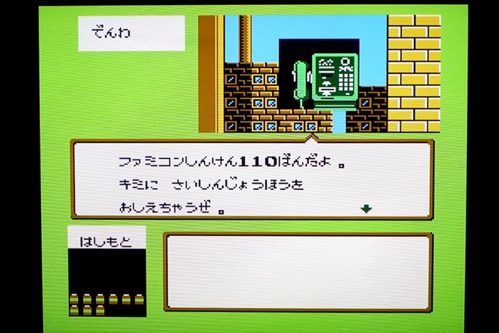 「ファミコンジャンプ 英雄列伝」のひとコマ。テレホンカードを買って、街の公衆電話で電話をかけるとヒントがもらえます。このあたりに、ノスタルジーを感じてしまう。あぁ、少年時代を思い出して涙が出そう……