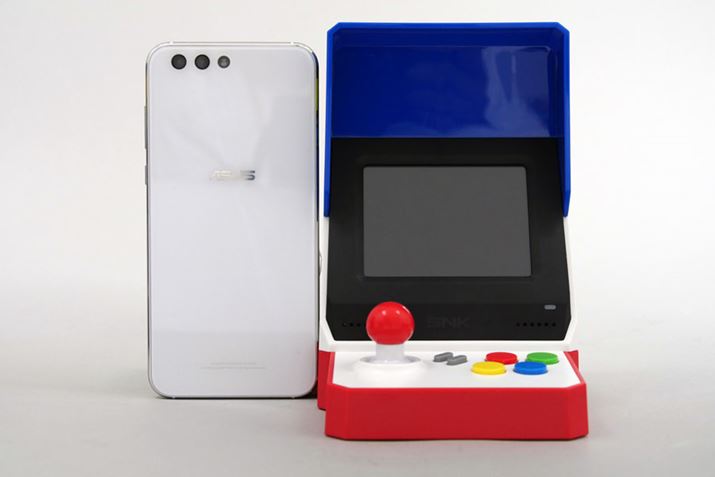 「ネオジオミニ」の大きさは、108(幅)×135(奥行き)×162(高さ)mmで、重量は390g。5.5型スマートフォンと並べてみると、そのサイズが伝わるでしょうか