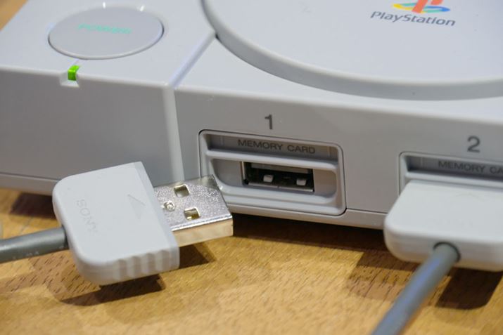 コントローラーはUSBケーブルで本体と接続。初代「プレイステーション」から変わっており、メモリーカードスロットはデザインだけで使用できません