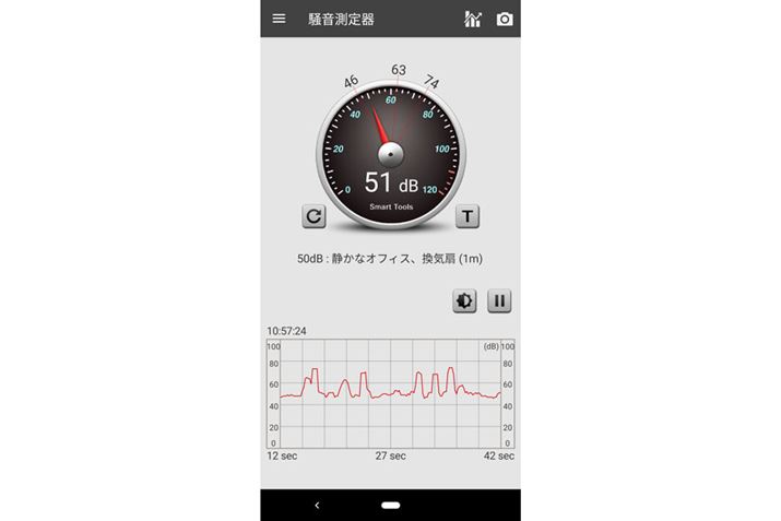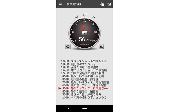 「騒音測定器:Sound Meter」によれば、50dBで「静かなオフィスや換気扇(1m)」、60dBで「話の音、デパート店内の騒音」、70dBで「騒々しいオフィス、電話着信音」、80dBで「地下鉄の騒音、掃除機」とのこと