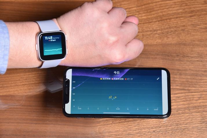 アプリ「騒音測定器:Sound Meter」を起動したスマホを目の前に設置し、「Fitbit Versa」を装着してプレイスタート