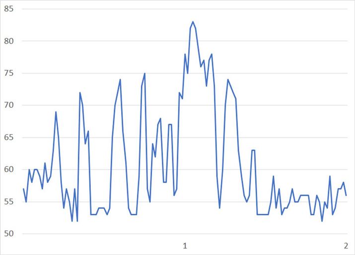 次は、心拍数のデータを見てみましょう。心拍数はFitbitの公式アプリから確認できますが、今回はより詳細なデータを得るためにFitbitの公式APIを使い、プレイ中の心拍数(毎2〜3秒)をCSV形式でデータ出力。それをグラフ化しました。