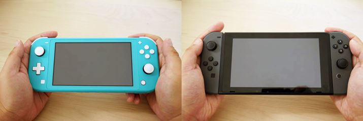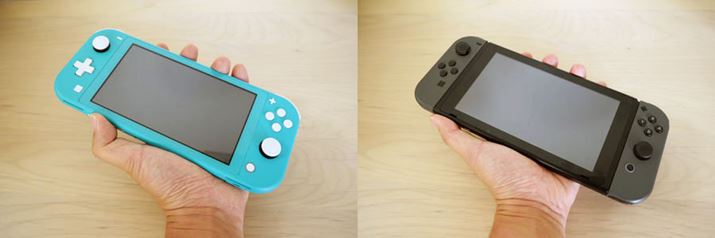片手で持ったときのホールド感は、スイッチライトのほうが圧倒的に持ちやすく、スイッチは、手が若干窮屈な感じです。重量もスイッチライトが約275g、スイッチが約398gとなっており、スイッチライトの軽さは非常に魅力的