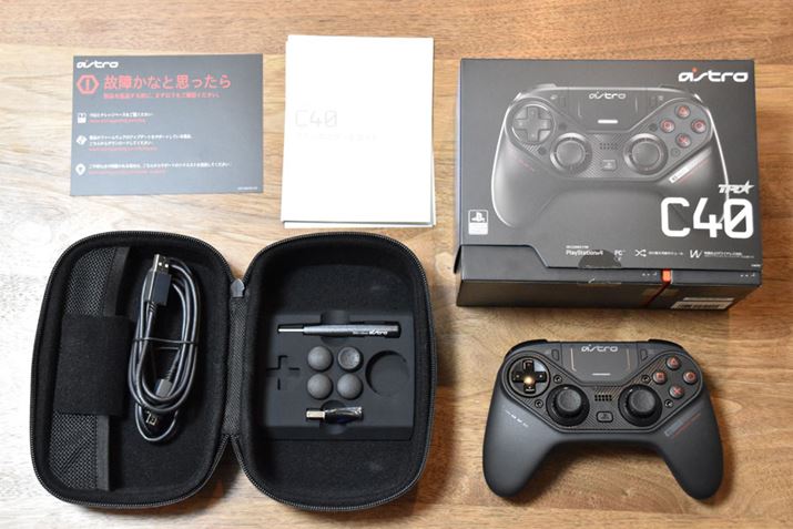 これがASTRO C40 TRコントローラー。キャリングケース内には、カスタマイズ用のドライバー、高さの異なる取替用スティック、無線接続用のUSBレシーバー、充電用のUSBコードが入っています