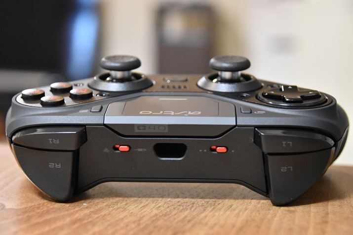 コントローラー上部には、充電用のUSBポート、無線/有線切り替えスイッチがありました。ワイヤレス使用時は、最大12時間以上の連続使用が可能です