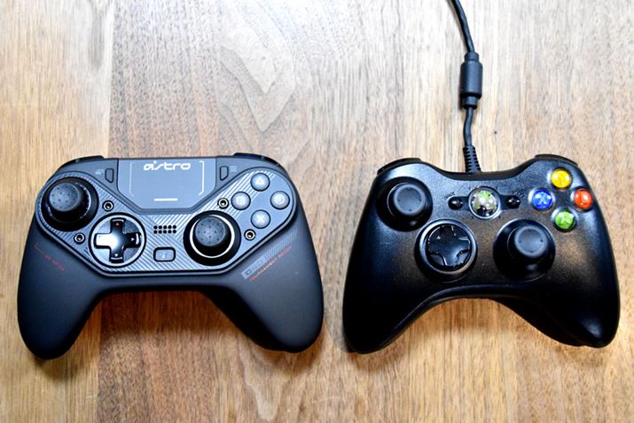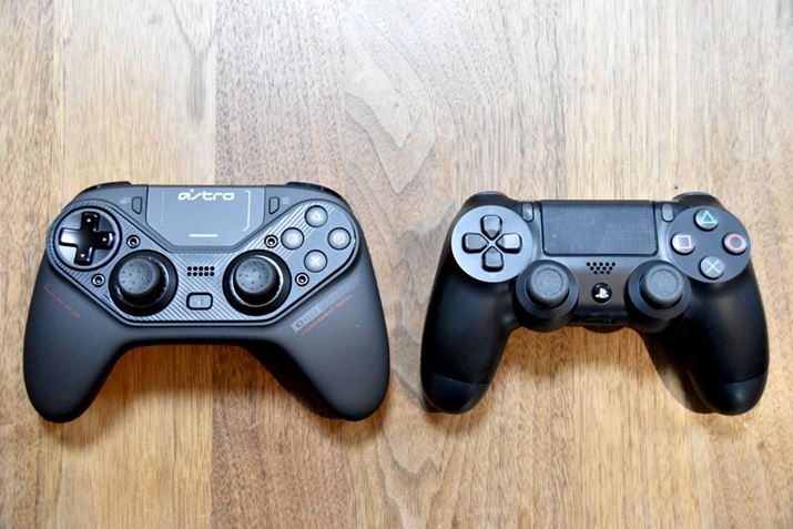 ASTRO C40 TRコントローラー(左)とDUALSHOCK 4(右)の大きさを比較。ASTRO C40 TRコントローラーのほうが、ひと回り大きいのがわかります