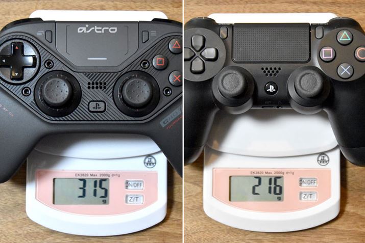 ASTRO C40 TRコントローラー(左)とDUALSHOCK 4(右)の重量を比較。ASTRO C40 TRコントローラーのほうが約100g重いようです